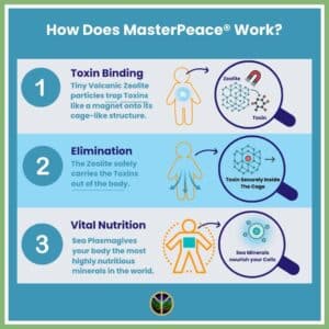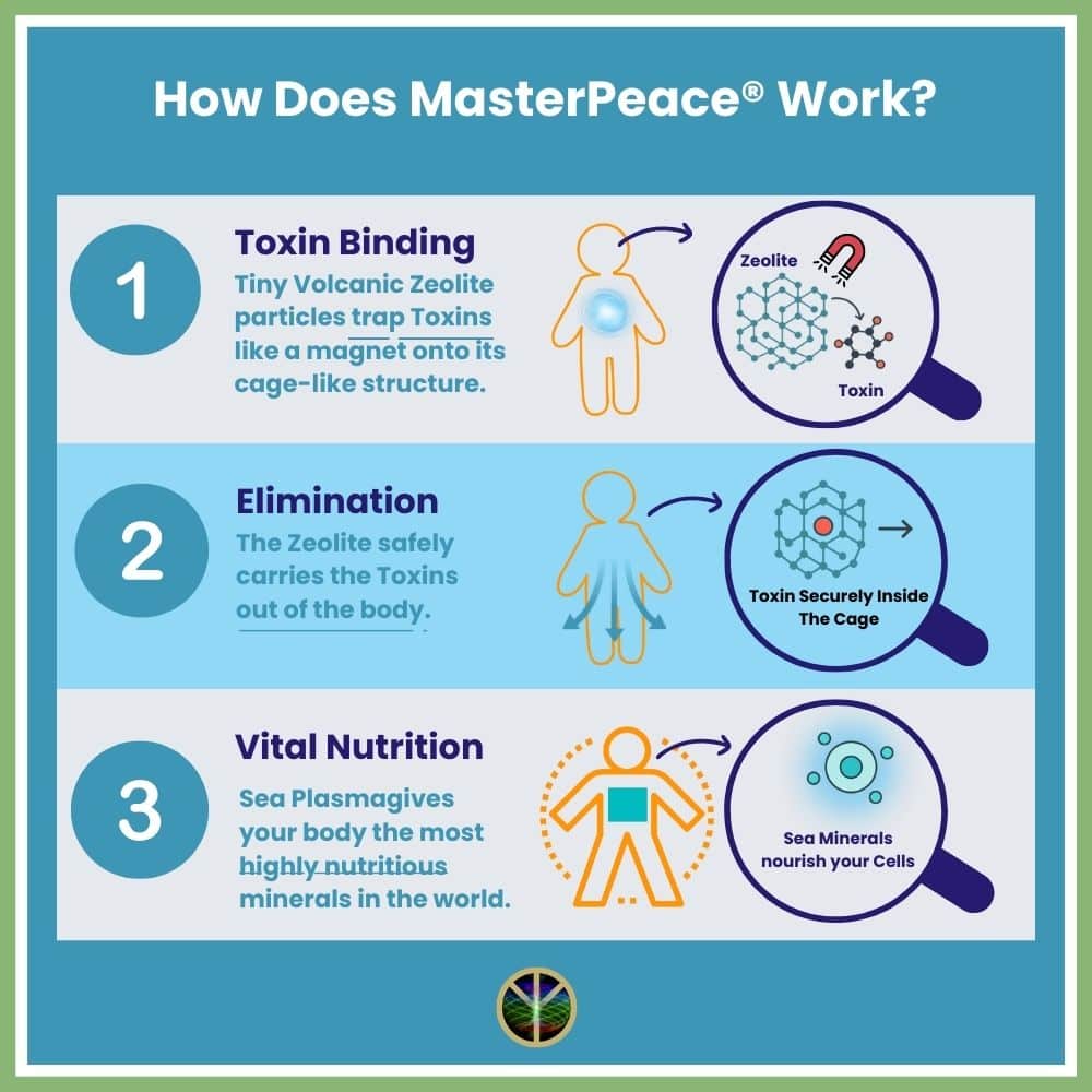 - MasterPeace uses microscopic zeolite to attract and bind these toxins like a magnet.
